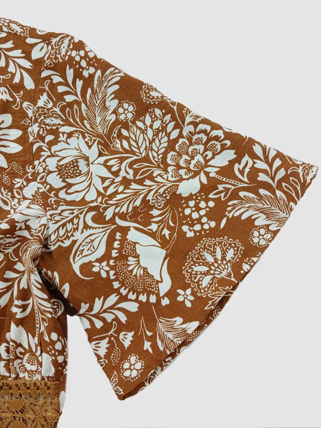 Lace Detail Printed Short Sleeve Midi Dress - Byyde