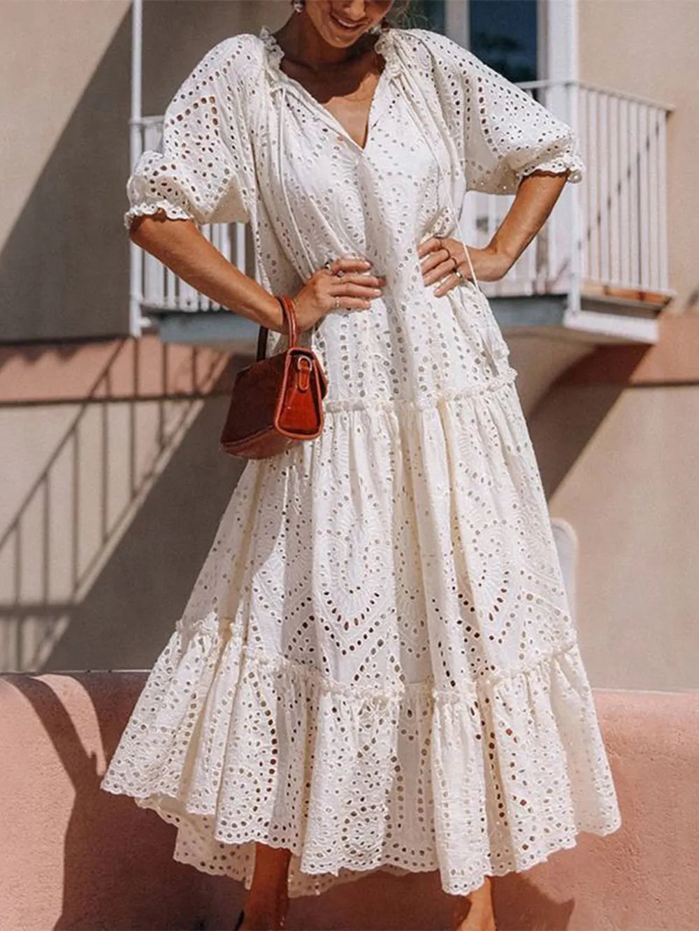 Tie Neck Half Sleeve Tiered Dress