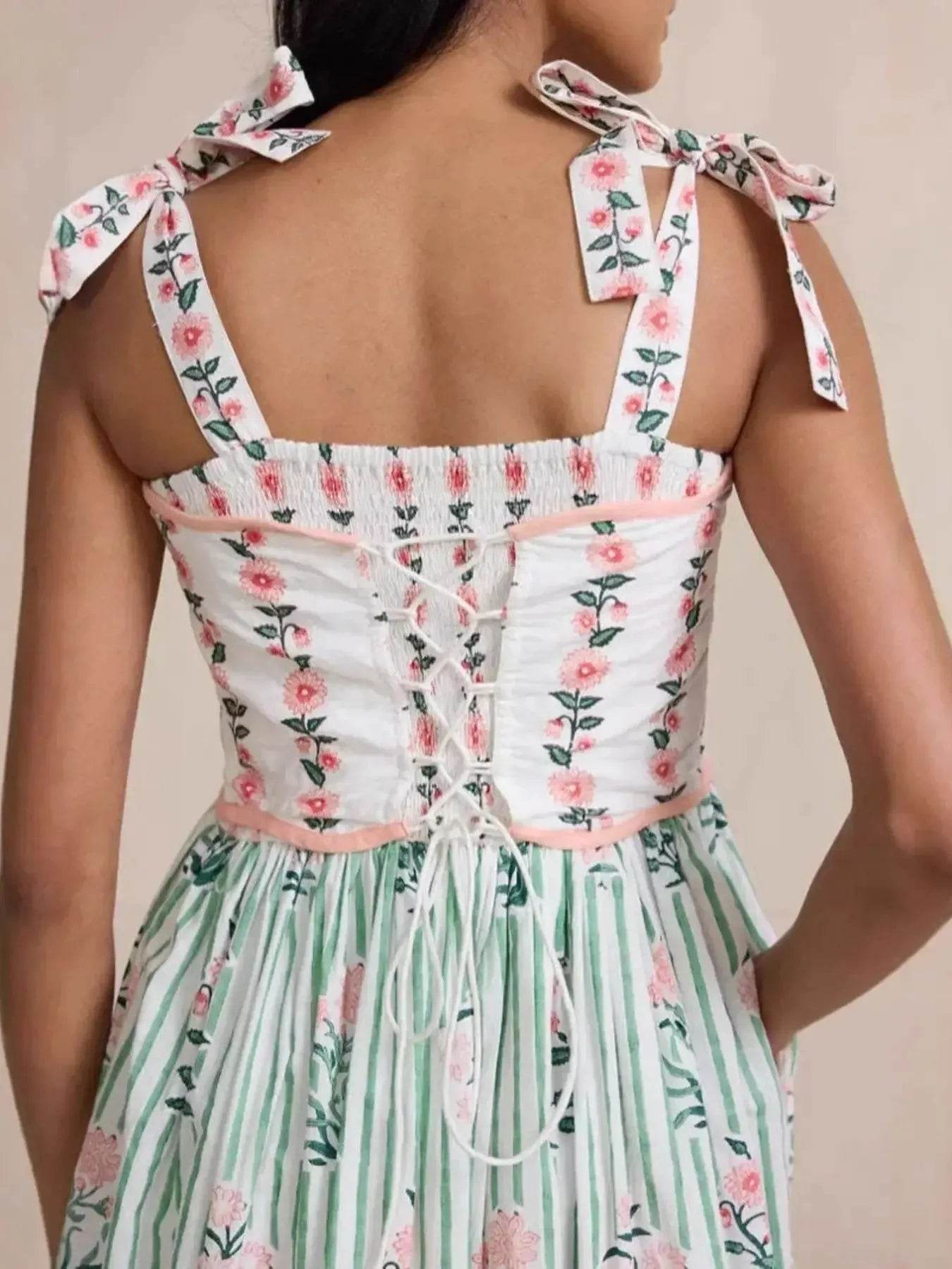 The Floral Striped Maxi Cami Dress with Tie Straps expertly merges delicate floral patterns with classic stripes for a unique, sophisticated look. Featuring adjustable tie straps, it ensures a personalized fit while maintaining a graceful maxi silhouette. Crafted from premium fabric, this dress offers both comfort and fluidity, making it an ideal choice for elegant daytime events or refined casual occasions.