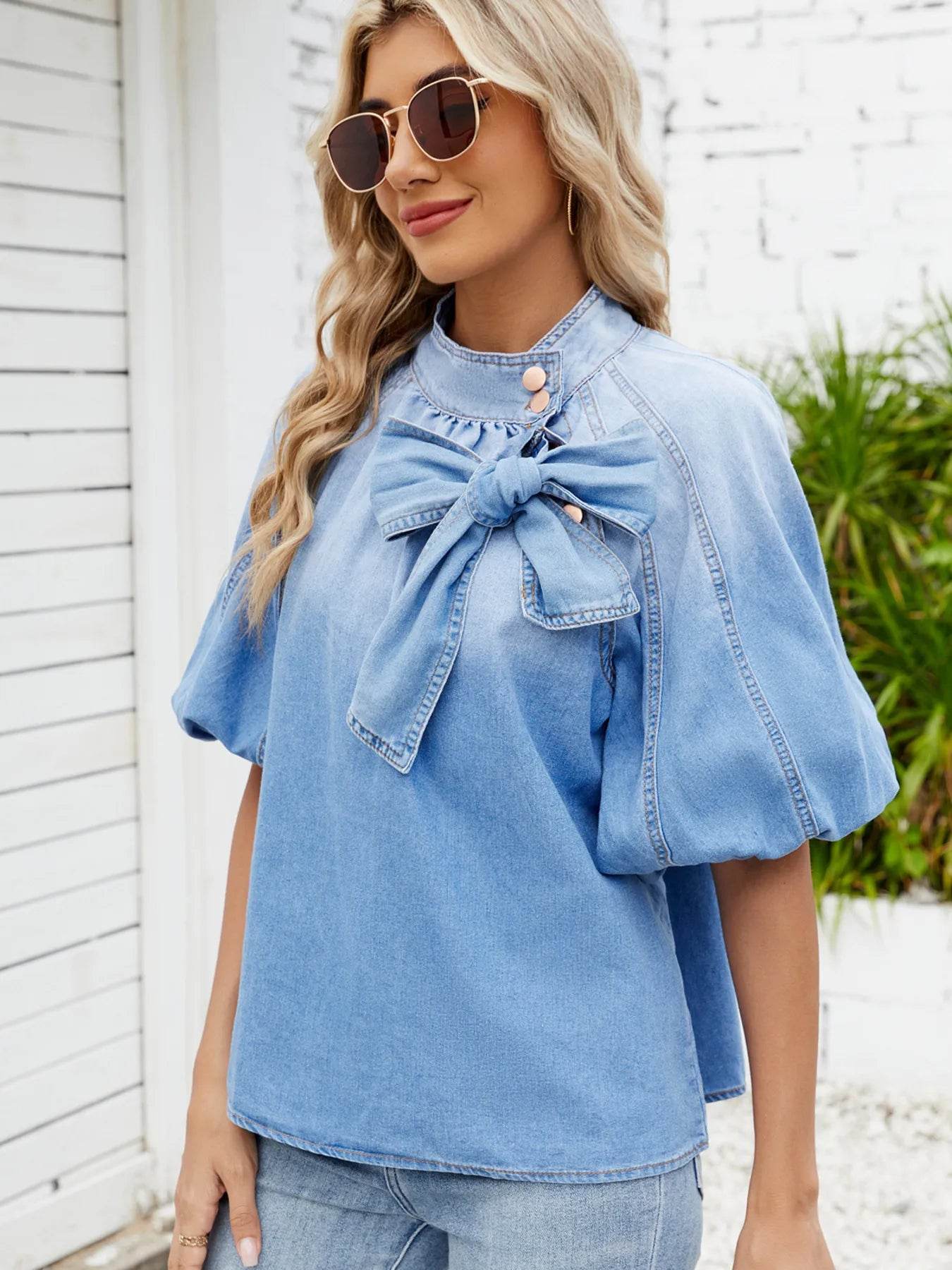Denim Bow Tie Puff Sleeve Top - Byyde