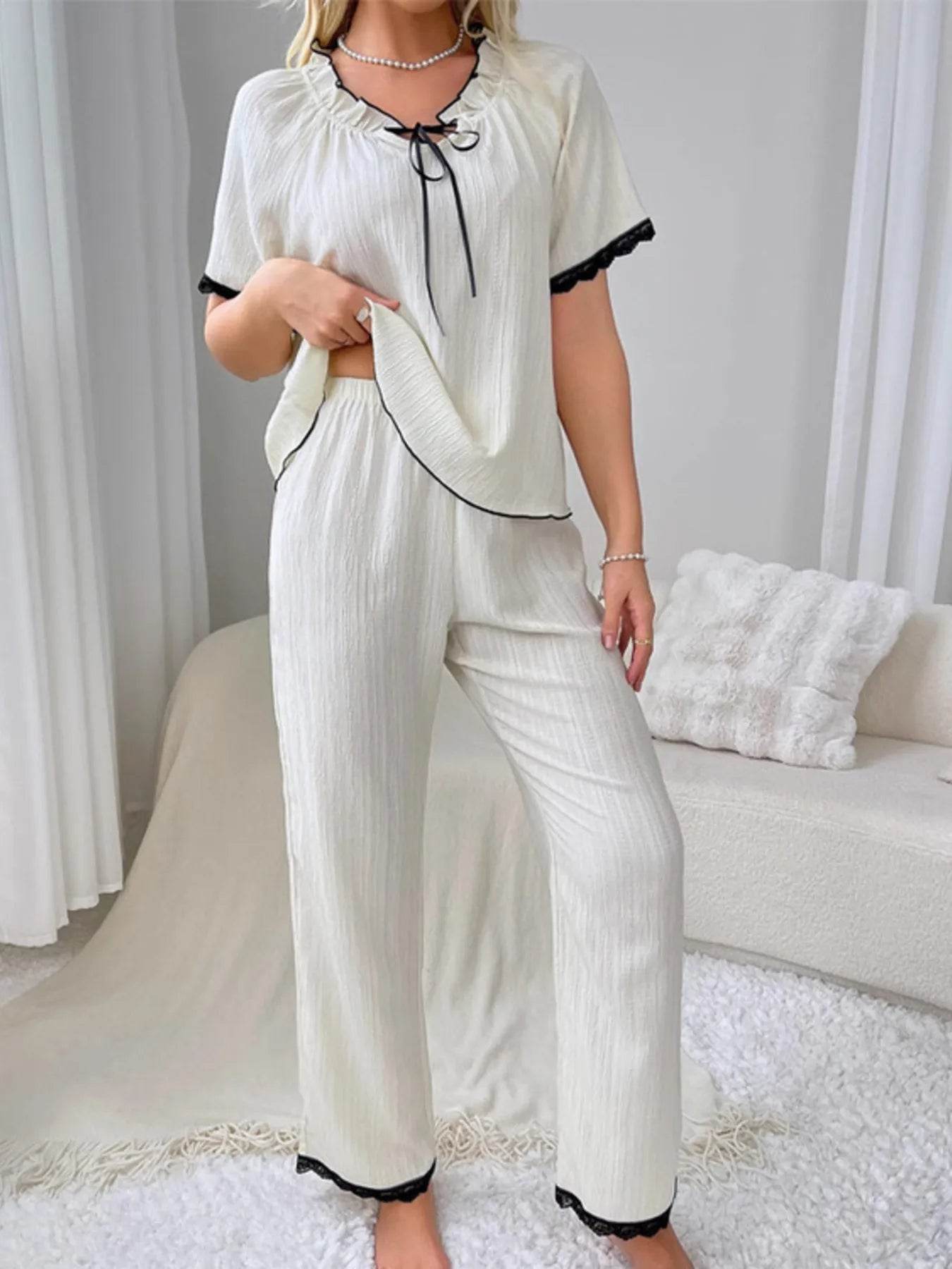 The Contrast Trim Short Sleeve Top and Pants Set is expertly crafted to blend classic design with modern accents. Featuring a short sleeve top and matching pants, both highlighted by subtle contrast trim, this set offers a polished and cohesive look. Designed for comfortable wear, it provides versatile style suitable for lounging or casual outings.