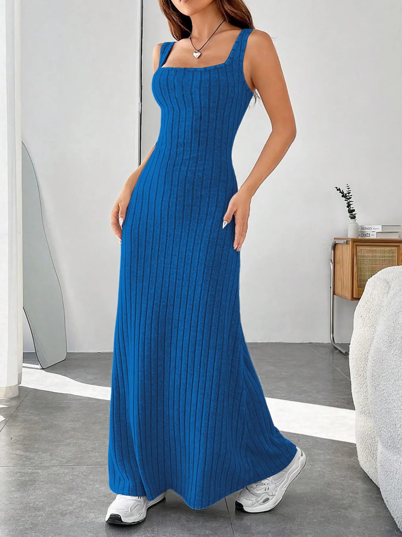 Ribbed Knit Square Neck Sleeveless Maxi Dress