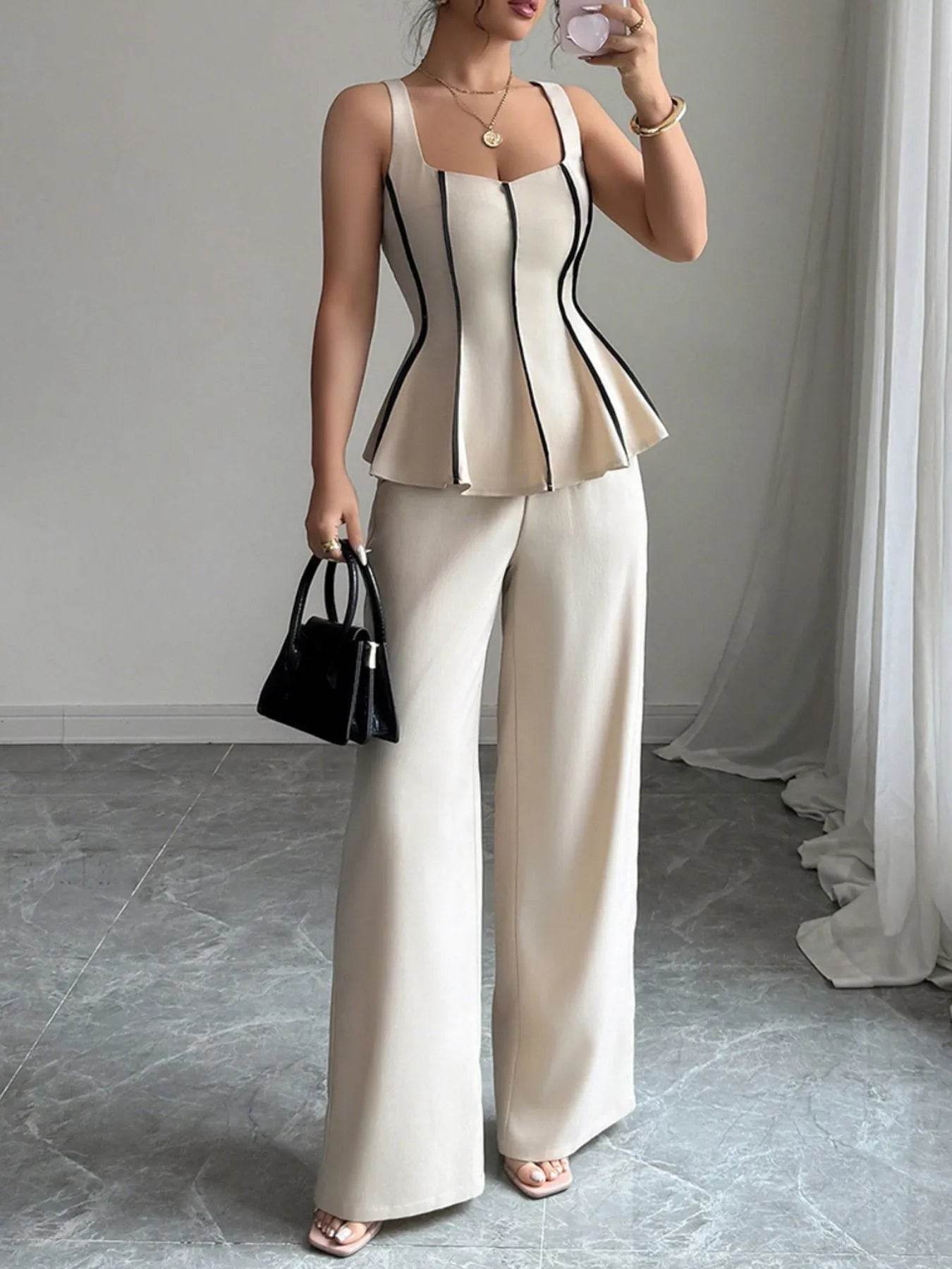 The Contrast Piping Top and Wide Leg Pants Set combines tailored sophistication with modern comfort. Featuring sharp contrast piping details, the top complements the flowing wide-leg pants for a balanced and polished silhouette. This set is ideal for professional or stylish casual wear, offering effortless elegance and movement.