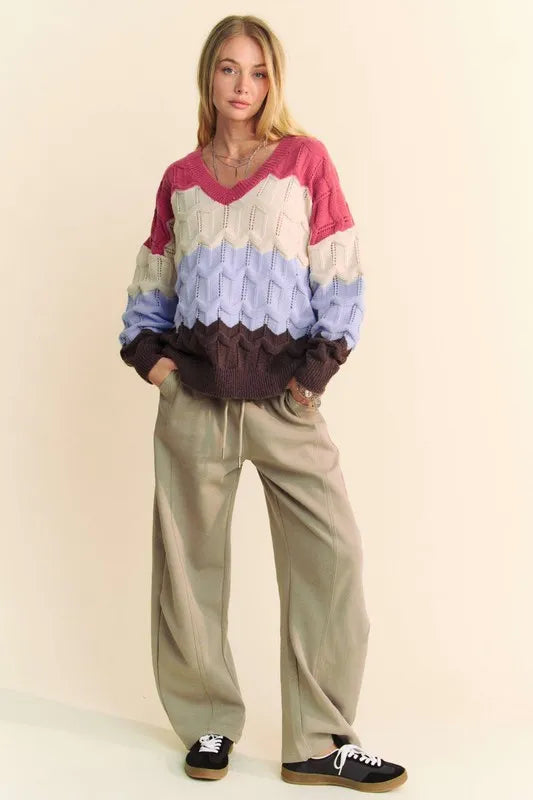 The Wavy Texture Color Block V-Neck Sweater is a stylish and unique choice for your fall and winter wardrobe. The wavy texture adds a touch of interest and dimension to this cozy sweater. With a color block design, it brings a modern and trendy vibe to your outfit. The V-neckline adds a flattering silhouette, making it a versatile piece that can be dressed up or down for various occasions. Stay warm and fashionable in this eye-catching sweater.