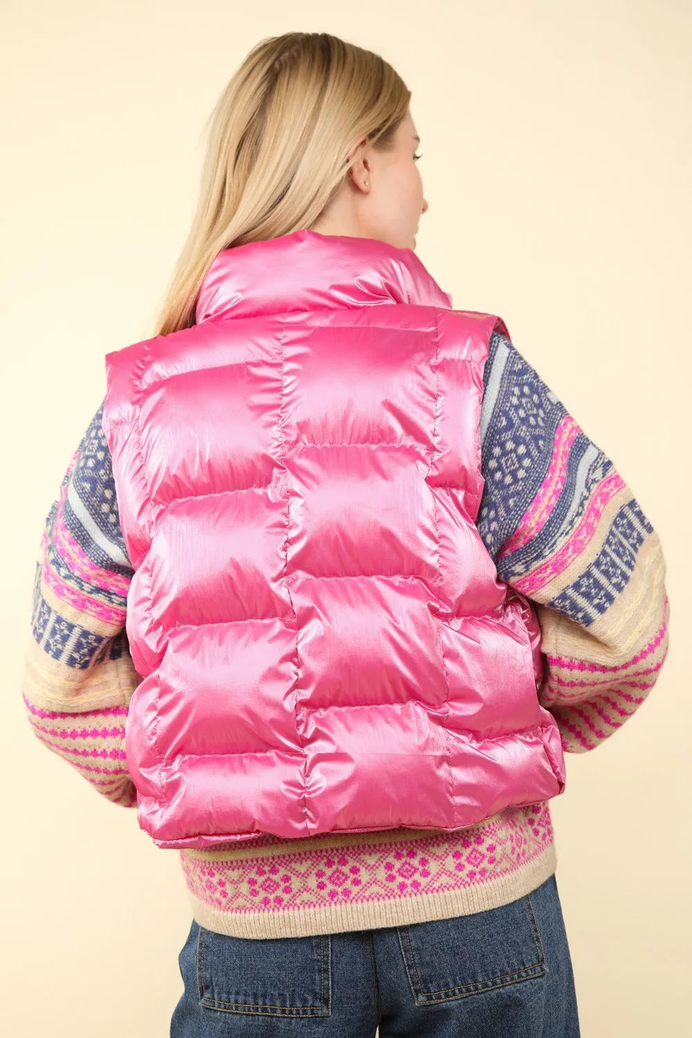 The Shiny Metallic Zip Up Puffer Vest brings a bold, modern edge to your winter wardrobe. Its high neck provides extra warmth and style, while the side pockets offer practical storage. The metallic finish adds a sleek, eye-catching touch, making it a standout piece for any outfit. Lightweight yet insulating, this vest is perfect for layering over your favorite sweaters or shirts. Its zip-up design ensures easy wear and versatility. Ideal for both casual and chic looks, it combines functionality with a high-fashion flair.